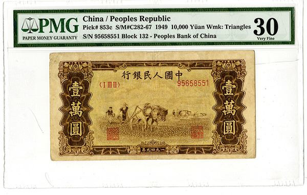 China, 1949, 10,000 Yuan, P-853c, (S/M#C282-67), Issued banknote, Brown, Farmers plowing with horses, back dark blue and brown, boy farmer seated with livestock, Block 132, S/N 95658551, PMG graded Very Fine 30, large margins and fresh appearance.