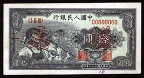 1949. 10 Yuan. P-816 Unlisted specimen. (S/M #C282-23). Farmer and worker on left. Specimen overprints and "000000" serial numbers with reference numbers on the back. AU to Uncirculated condition.