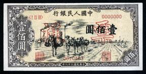 1949. 100 Yuan. P-836 Unlisted specimen. (S/M #C282-46). Donkey train and factories. Specimen overprints and "000000" serial numbers. AU condition with some light handling problems.