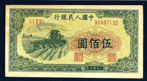 China, 1949, 500 Yuan, P-846a, (S/M#C282-54), Block 123, Issued banknote, Green on light green underprint, Tractor plowing field at left, S/N 96697132, PMG graded Extremely Fine 40 with light toning on upper left margin.