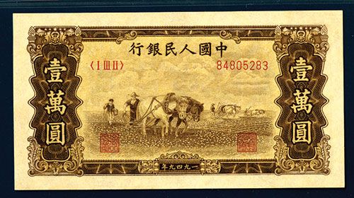 China, 1949, 10,000 Yuan, P-853c, (S/M#C282-67), Block 132, Issued banknote, Brown, Farmers plowing with horses, back dark blue and brown, boy farmer seated with livestock, S/N 84805283, PMG graded Gem Uncirculated 66 EPQ (Exceptional Paper Quality), a trophy note that will be treasured by the lucky winner.