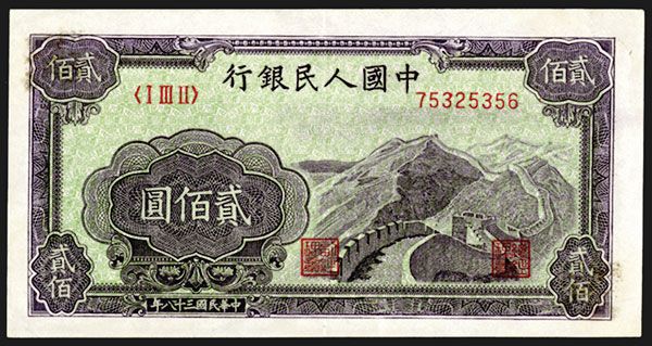 China, 200 Yuan. P-838, Great Wall at right. Tape residue in alternate corners on back, a bit of bleed thru to front concealed by the corner designs. Otherwise EF or better.