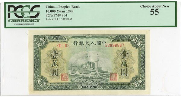 China, 1949, 10,000 Yuan, P-854c, (S/M#C282-66), Issued banknote, Dark green and black, Warship at center, brown back, S/N 53898867, Block 312, PCGS graded Choice About New 55, Very attractive note with large even margins, bright colors and sharp corners and other than a very light vertical middle fold, the note looks exceptional for the grade.