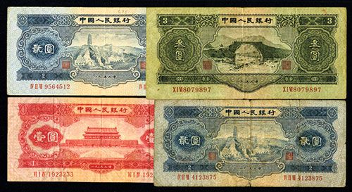 Lot of 4 notes, Includes 1 Yuan, P-866, VF; 2 Yuan (2 examples), P-867, one Fine with splits at folds and small thin on back middle and the second Choice VF; and, 3 Yuan, P-868 (S/M#C283-12), Issued banknote, Green and black on light orange, old bridge at center, VF to Choice VF condition. Scarce and popular banknote series