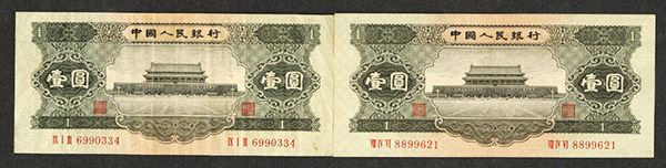 China, Peoples Republic. 1 Yuan. P-871 (2). S/M C283-40. Great Hall at center on face, Arms at center on back. Choice Extremely Fine and Choice Very Fine respectively. 2 pieces.