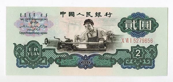 China, 2 Yuan, P-875a, S/M#C284-, Issued, black and green on m/c, S/N (10-6-1) 5279656, PMG graded Choice Uncirculated64 EPQ condition. Scarce note.