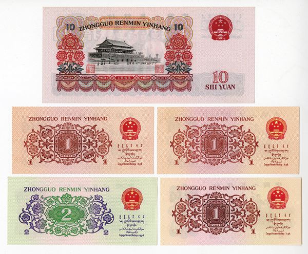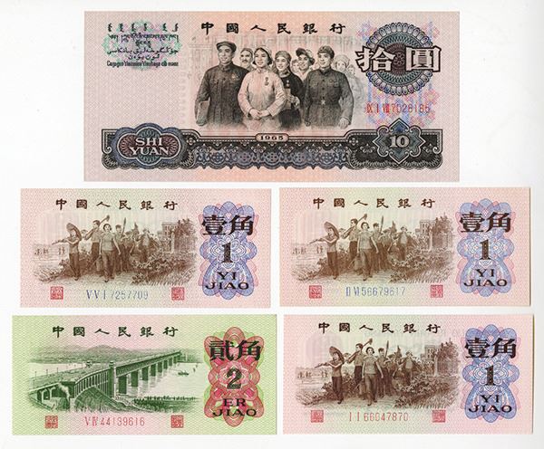 China, Lot of 5 notes, Includes 1 Jiao, P-877c (2) and p-877d; 2 Jiao, P-877c; and 5 Yuan, P-879a,, Choice VF to XF and P-874c, Uncirculated to CU; also includes 5 Yuan, P-876a, All are in Uncirculated to Gem Uncirculated.