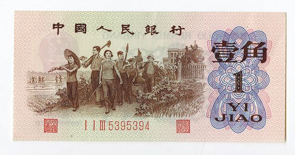 China, 1 Jiao, P-877h, Issued, brown on m/c, Block (1-1-3) S/N 5395394, PMG graded Choice VF 35 EPQ condition. Scarce note.