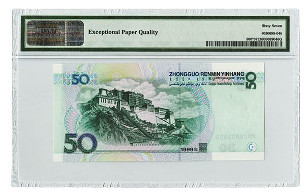 China. Issued 50 Yuan, 1999, P-900*, PMG Superb Gem Uncirculated 67 EPQ, replacement S/N AH02033350.