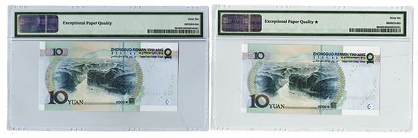 China. Issued 10 Yuan, 2005, P-904, PMG Gem Uncirculated 66 EPQ*, fancy S/N P6A0000000; and Gem Uncirculated 66 EPQ, fancy Ladder S/N C5Z1234567.