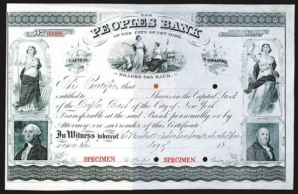 New York, NY. 18xx (ca.1860-70's), Odd Shares, Specimen, Black with no undertint, New York arms on top middle, Washington lower left, Standing Liberty upper left, Franklin lower right and Justice right, Specimen overprints, POC's. Rare and very attractive and ornate New York bank certificate. ABNC.