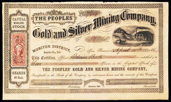 Colorado, 1864, 10 Shares Issued and Uncancelled, # 704, Small vignette of mine on top right with red 25 cent George Washington Inter. Revenue stamp top left, VF condition with only small creases, Bosqui & Co. Stock was issued to Edwin Booth the brother of John Wilkes Booth and a world renowned Shakespearian actor who also founded the Players Club and dedicated his home at Gramercy Park in Manhattan to it. In 1869 Booth opened his own theatre ÒBooth's TheatreÓ at 23rd and 6th in New York City. The theatre was never financially stable and after the Panic of 1873 the theatre finally went bankrupt in 1874.