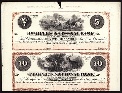 Helena, Montana Territory, ND (ca.1870-80's), $5-$10, Haxby Unlisted, Modern “Proprietary Proofs”. $5 with men plowing in middle, the $10 with family of elk by stream, Black printing with dark burgundy red underprint printed on thin white card, CU to Gem Uncirculated condition. National BNC. Archival “Proprietary” proofs rarely seen in sheet form. (ABN Commemoratives, AIA XI, May 15, 2012)
