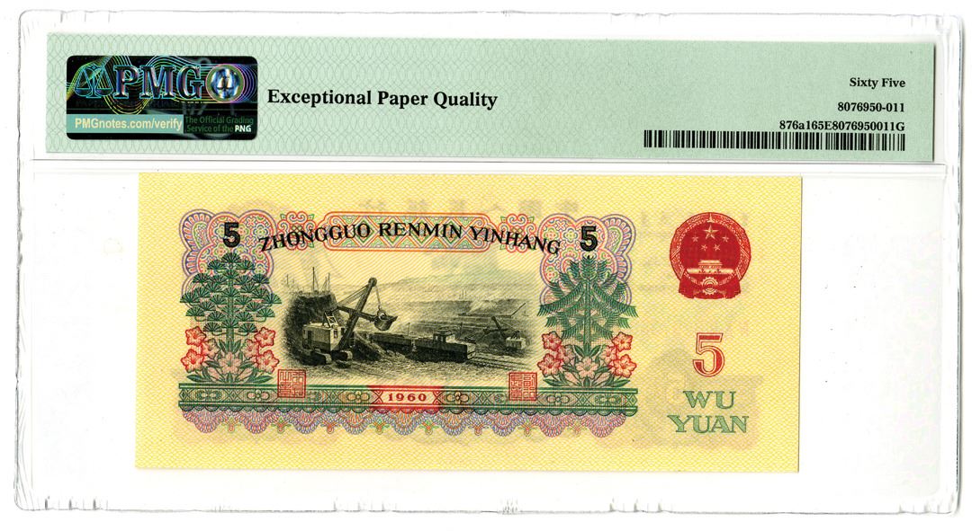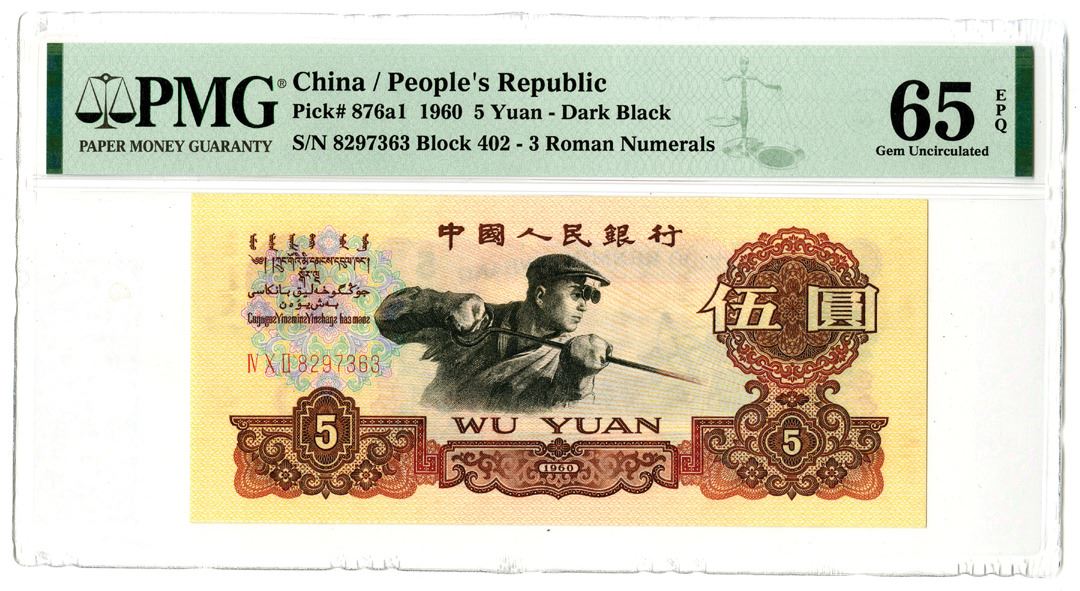 China, 5 Yuan, P-876a1, Issued banknote, S/N's 8297363, Block 402, Prefix 3 Roman Numerals, PMG graded Gem Uncirculated 65 EPQ.