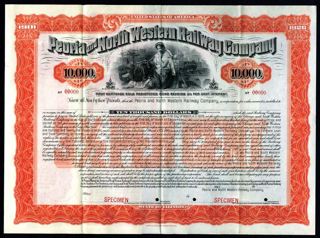 Nebraska, $1000, Registered 1st Mortgage 3 1/2% Gold Bond Specimen, Orange border with seated allegorical woman with ship and train, POC's, Coupons attached, XF, ABNC. Unlisted Railroad in Cox. Attractive and rare.