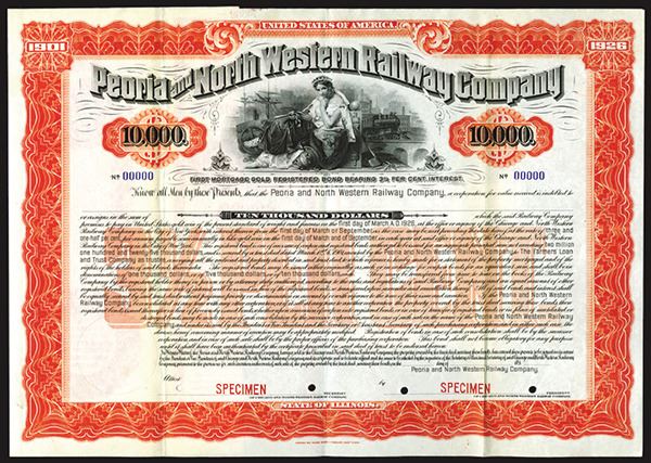 Illinois. $10,000 Specimen 3 1/2% First Mortgage Gold Registered Bond. Black printing with an ornate red/orange border and underprint in a horizontal format. Allegorical woman top center with city behind her at top. POC's and red SPECIMEN overprints, ABNC. Unlisted railroad in Cox. Rare and attractive bond.