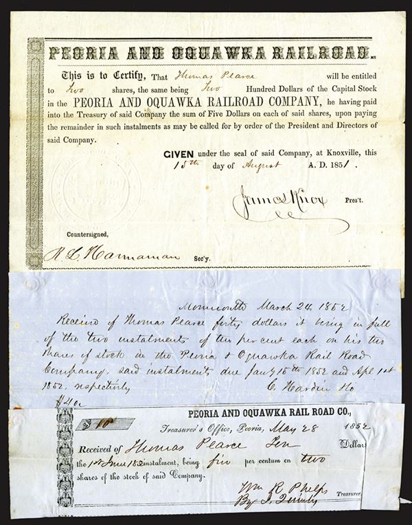 Knoxville, Illinois. 2 shares, ornate left border, signed by James Knox, brother of John Knox, IU, VF+. Also included is a written receipt for the balance due on the two shares, and an installment receipt. We know of only one other similar certificate. [3]