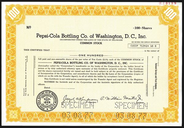 DE. 100 Shrs, Stock Certificate Specimen. EF+