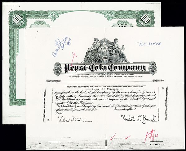 Delaware. Odd Shares Capitol Stock Proof Certificate. Black print with no border, with writing in the margins. Vignette of two allegorical figures flanking a bottle of Pepsi at top of page. Fine-VF condition.