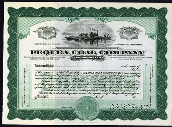 Pennsylvania, ND (1940s). Odd Shares Specimen Stock Certificate, Black text with green border, Mining scene at top center. Canceled POC at bottom right. Fine-VF condition.