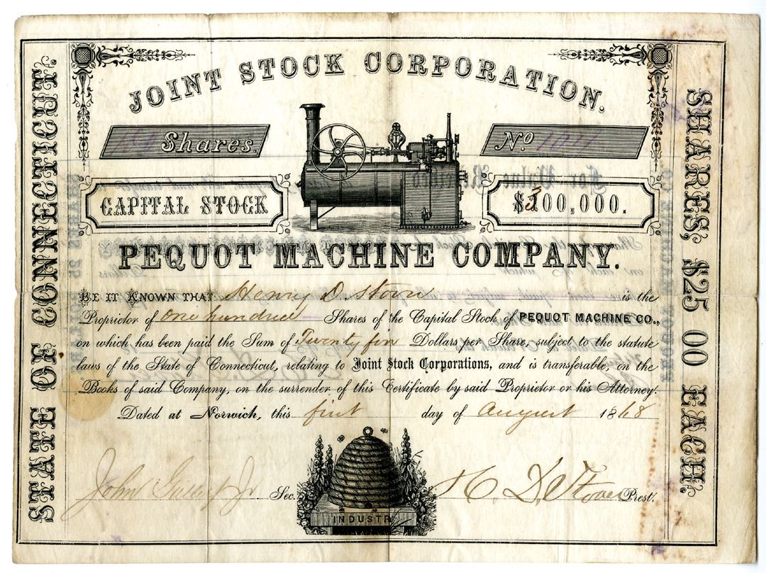 Norwich, CT. 1868, 100 Shares, I/U Stock Certificate. Black printing on translucent white paper, Detailed Machine illustration over title with beehive at bottom middle, S/N 104, VF condition with toning spots. Additional background information included as well as a an image of an advertisement and a photo of the old factory for the company. Rare if not unique. (John E. Herzog Collection).