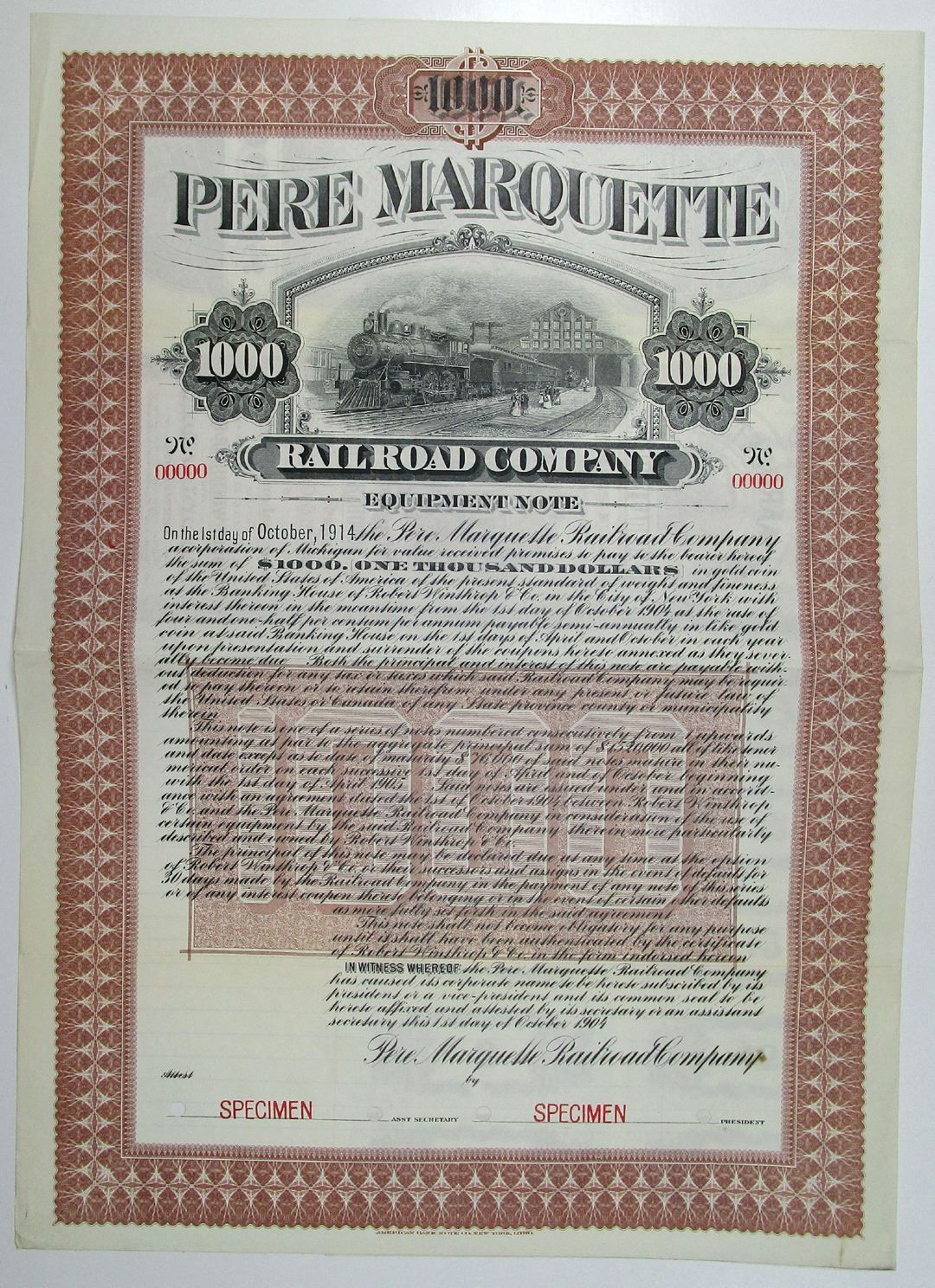 IN & MI, 1904. $1000 Specimen 4.5% Equipment Note Coupon Bond, Black text with brown border and undertint, Train exiting terminal at top center. Red specimen overprints, 00000 serial numbers, and POCs. VF condition, ABNC. Only listed in specimen format in Cox and one of only 3 found in the ABN Archives in 2002. Rare
