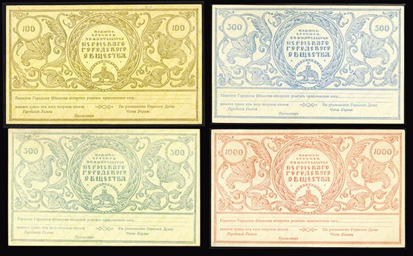 Russia, Lot of 4 notes, All are 1917 Perm City Association Remainder issues, all with Ornate flower design on face with bear, Includes 100 Rubles, P-S986r, Brown, back with text, PMG graded Extremely Fine 40 with a note of a small area of annotation in pencil that could be erased; 300 Rubles, P-S987r, listed as blue on light green but this example is green on light green, back with text, PMG graded About Uncirculated 55 with a note of a small area of annotation in pencil that could be erased; 500 Rubles, P-S988r, blue on lilac, back with text, PMG graded Extremely Fine 40; 1000 Rubles, P-S989r, red on light red, back with text, PMG graded Extremely Fine 40, extremely rare group of notes that are shy the 5000 Ruble high denomination to make this a complete set, still rare notes in any form with most missing in any condition from most advanced collections. These are the only graded examples listed in the PMG census. They were also missing from the amazing "East Bay Collection" of Russian banknotes that the cataloger had the privilege of writing the catalog in 2008.