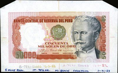 Peru. Banco Central De Reserva Del Peru. ca.1981-83. P-125 Unlisted. 50,000 Soles. 2 different banknotes. 1). P-125 Unlisted specimen banknote. Dated Nov. 5, 1981. Black "000000" serial numbers. Choice uncirculated; 2). P-125 Color Trial. Unlisted banknote. Printed from an individual plate with large margins that are not cut down to banknote size. Appears choice uncirculated. Colors are slightly lighter on this note. The Arms of Peru are olive-black on this note and red-brown on the specimen, the lower left "50,0000" denomination is olive-black on this note and red brown on the specimen and the undertints are slightly different. Rare specimen and color trial proof. Interesting and rare collection of archival production material relating to the design of this note. ABNC.