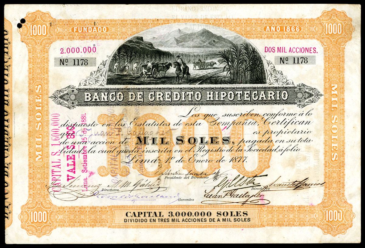 Peru, 1877. 1 Share=1000 Soles, Black and Orange on Cream, attractive vignette of men harvesting sugar cane from large fields, I/U, POC, VF+ with some soiling.