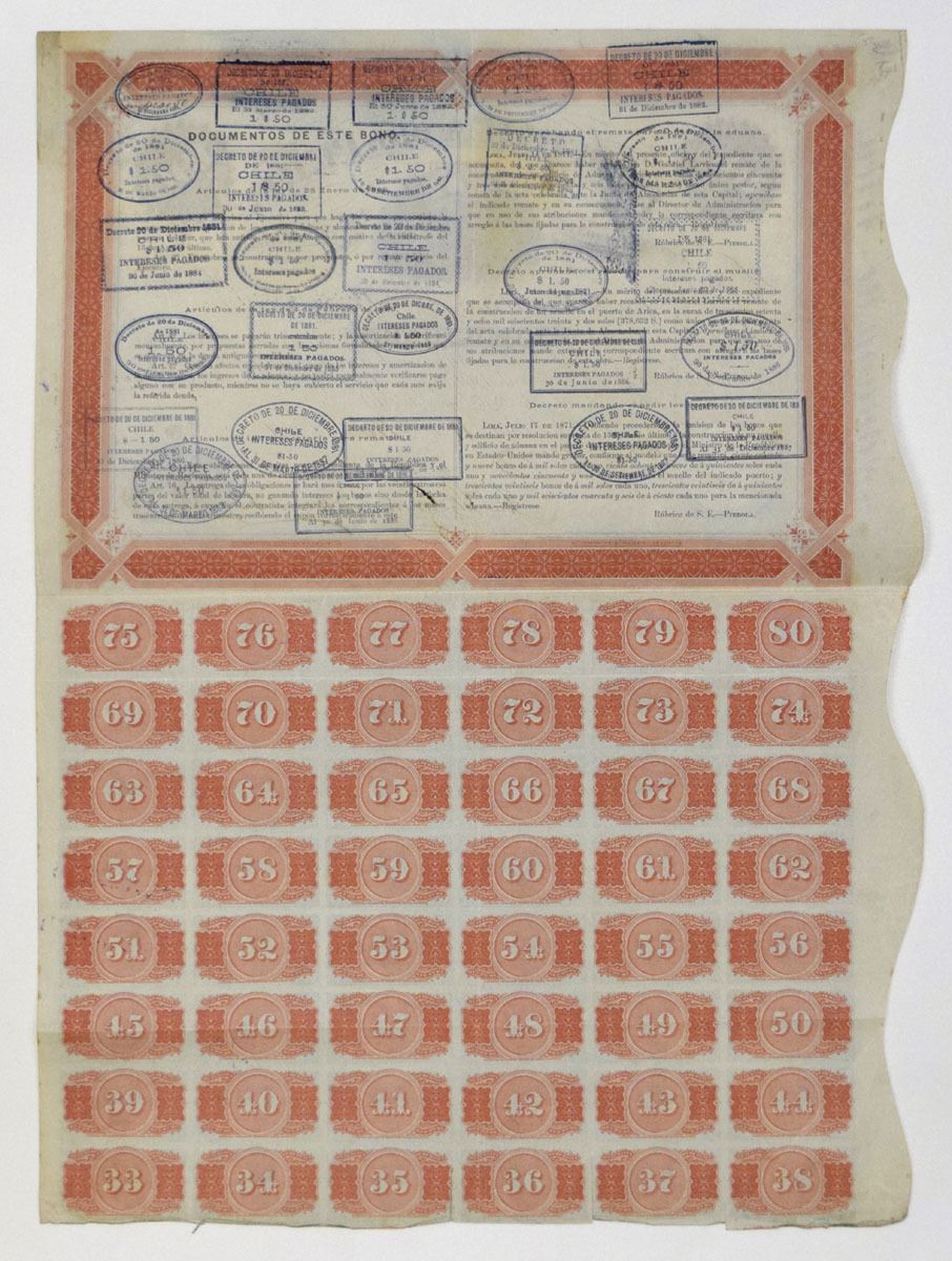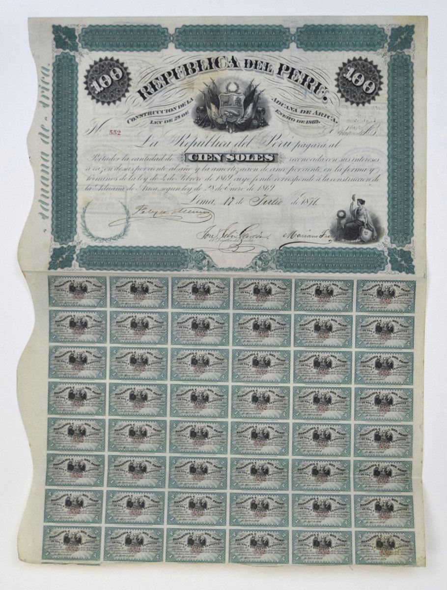 Lima, Peru, 100 Soles, I/U, Black on Green, Peruvian coat of arms. For the Construction of the regional customs office of Arica. VF, S/N 552, NBN.