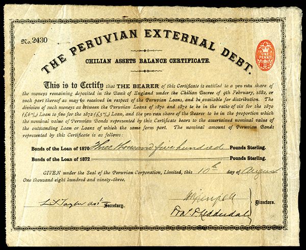 Peruvian External Debt, Chilean assets Balance Certificate, 1893 Bond Peru, 1893, 3,500.00 Pounds Sterling, Toned paper, VF, I/U.