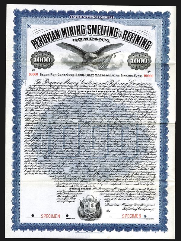 Peru. $1000, 7% Gold Coupon Bond, Eagle with American Flag on top, Peruvian Arms at bottom, black on green, Specimen overprints, POC's, VF-XF, ABNC. Rare and very attractive mining bond. 4 found in archive.