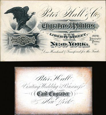 1880-81. 2 different business cards for Peter Hall and Peter Hall & Co. He was born in Birmingham, England in 1828 and died in Brooklyn in 1895. When he first came to this country, he started working for RWH&E from 1854 to 1859. He then worked for ABNC after this. In 1878 he was the Superintendent of the Engraving Division for Continental BNC. In 1880 and 1881 he engraved independently. 1). Peter Hall & Co. Eagle with text advertising types of engraving they do on white card with mounting stains on the back, othewise the card is in XF condition; 2). Peter Hall (ca.1850-60's) printed on white coated stock. XF condition. Rare business cards from this famous engraver.