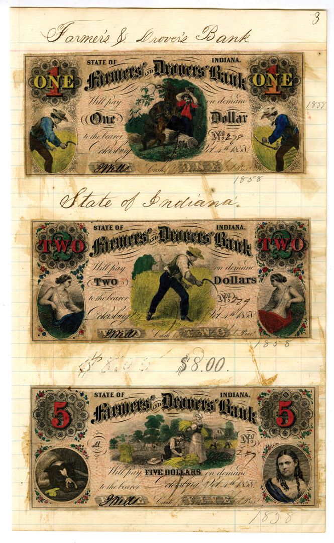 Indiana, 1858. Lot of 3 Obsolete Banknotes, Includes: $1, $2, and $5, All 3 notes are mounted on a single page and have had additional water colors added. All notes have vibrant colors and have small vignettes on each end with a large image in the center, Notes are in VF to AU condition and are mounted on lined paper. They possibly could be soaked, but the paint may run. (3 mounted on 1 sheet). Sold "AS IS" no returns accepted.