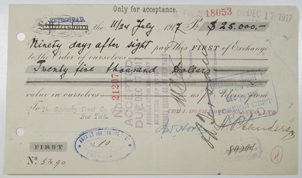 Russia, 1917. I/C First Exchange for $25,000. Includes St. Petersburg crossed-out and replaced with Petrograd. The city, known in English as "St. Petersburg." was changed to "Petrograd" in 1914 at the start of World War I because its original name sounded too German. Following Lenin's death in 1924, the city was renamed Leningrad until 1991, when it reverted back to Saint Petersburg. Fine condition with paid and accepted stamps throughout.
