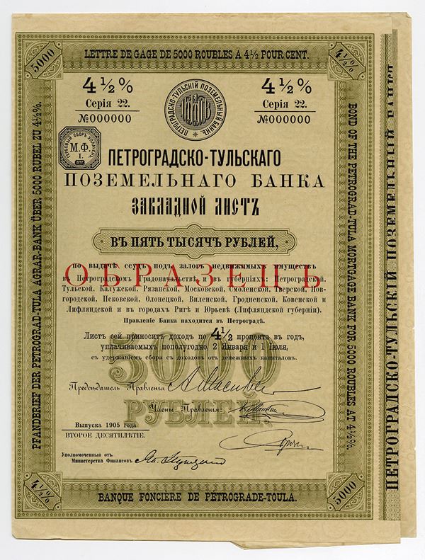 Imperial Russia, 1905, specimen 5000 Ruble 4.5% bond, small size bifold with coupons attached, series 22 serial 000000, overprinted "________" in red (Russian for specimen), bank seal at top, ornate pale green frame, text in multiple languages including Russian, French, German, English, and others. Choice Very Fine.