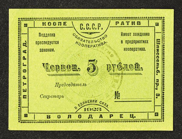 Petrograd, Russia (USSR), 5 Rubles, P-Unlisted, Black on light green paper, hand stamped in middle but no serial numbers, possibly a remainder, Uncirculated with stamp hinge mounting remnants on back that could be removed. (The Pogrebetsky Family Archives)