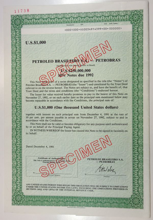 Brazil. $1,000 Specimen 10% Coupon Bond, Black print on green border and under tint on modern certificate, Company title at top, Specimen overprints and POC's, VF-XF condition, ABNC,