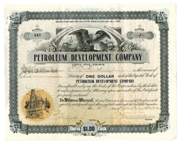California. 1 Shares Capital Stock Issued Certificate, Black print on black border and orange under tint, Bald Eagle at top and oil field at bottom left corner, Fine-VF condition, Goes.