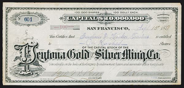Cedar Hill, Virginia District, Nevada, 1872, 100 Shares, #601, I/U stock certificate, Black with ornate title with man jumping through the letter "P". VF condition. Scarce Nevada mining location.