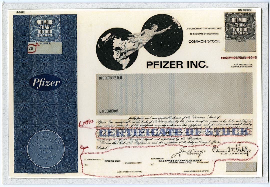 Delaware, 1983. <100,000 Shares Unique Production Model Stock Certificate, Black text with blue border at left and underprint, Allegorical Hermes with pair of globes at top center. Mock-Up with pasted on certificate elements, protected behind plastic, and mounted on white cardstock in gray folder. Also includes red design edits. VF condition, SC-USBN. Pfizer Inc. is an American multinational pharmaceutical and biotechnology corporation, notable today for its Covid-19 vaccine. Unique piece from a famous pharmaceutical drug manufacturer.