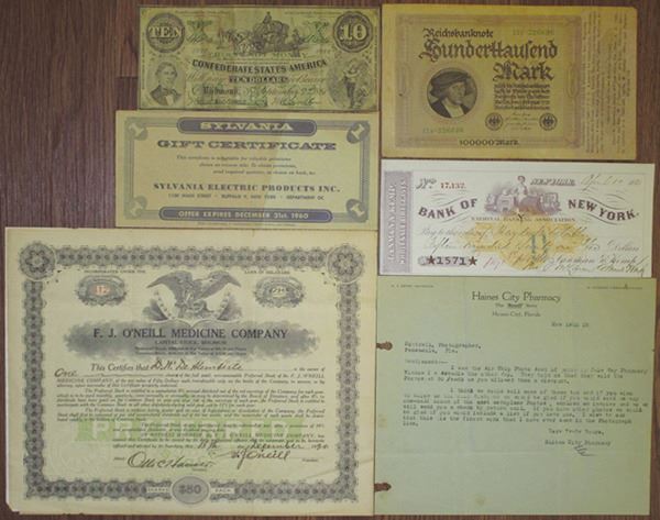 Various States, Lot of 7 items, includes Advertising notes, a German inflation note with English advertising text on the side, and a 1920 stock certificate for F.J. O'Neill Medicine Co., VG to AU condition.