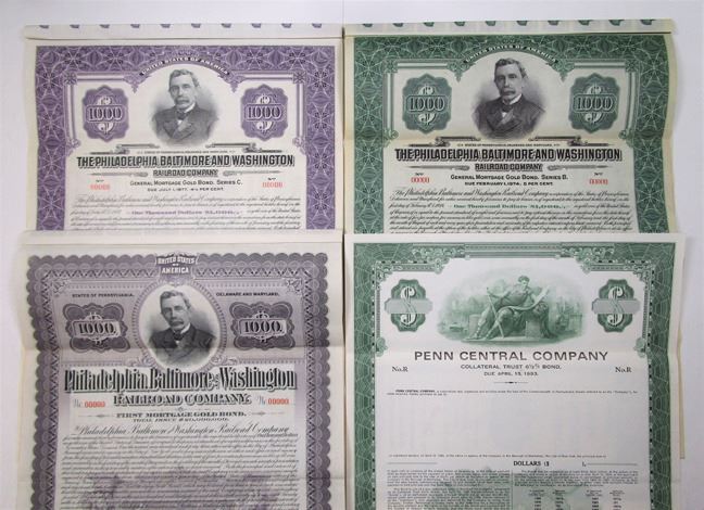 Pennsylvania, Delaware, & Maryland, 1917 to 1969. Lot of 4 Specimen Bonds, Includes: 1917, Unlisted Date in Cox, Philadelphia, Baltimore & Washington Railroad Co, $1000 Specimen 4% First Mortgage Gold Coupon Bond with gray/purple border; 1924, $1000 Specimen 5% General Mortgage Series B Gold Coupon Bond, Green border and underprint; 1927, $1000 Specimen 4 1/2% General Mortgage Series C Gold Coupon Bond with a purple border; and, 1968, Penn Central Co., $-Odd Registered 6 1/2% Specimen Collateral Trust Bond. All have Specimen overprints, POCs, and are in VF-XF condition. ABNC. (4). All of the bonds are listed except for the 1917 dates bond in Cox. Sold "AS IS" no returns accepted.