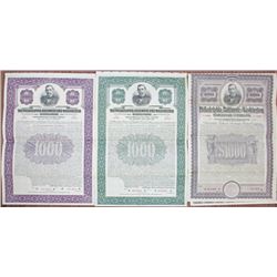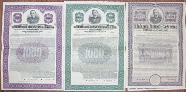 Pennsylvania, Delaware & Washington, Lot of 3 Specimen Gold Coupon Bonds, all with portrait of George Roberts, Includes $1000 Specimen 4% First Mortgage Gold Coupon Bond in gray; $1000 Specimen 4.5% General Mortgage Coupon Bond in purple; $1000 Specimen 5% General Mortgage Gold Coupon Bond in green. All have red specimen overprints, 00000 serial numbers, and POCs. Purple and green bonds are unlisted as specimens in Cox. ABNC. (3)
