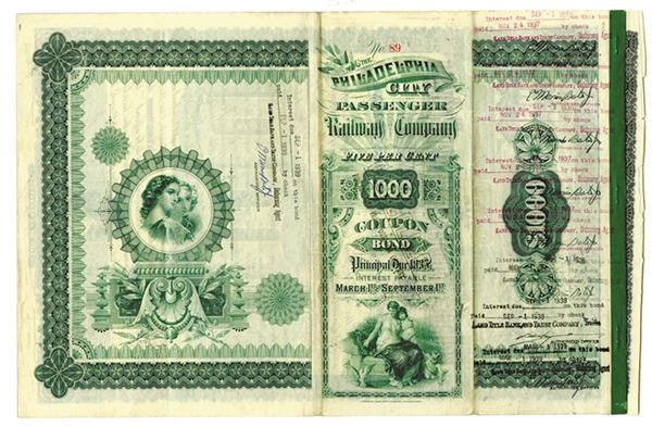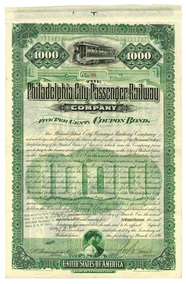 Pennsylvania. $1000 5% Coupon Bond, Black print on ornate green border and under tint, Electric railcar at top, Fine-VF condition with splitting along fold lines and no coupons attached condition, ABNC.