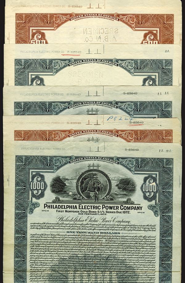 Philadelphia, Pennsylvania. Lot of 4 bonds, two $500 bonds and two $1000 bonds, all have separate coupons as well as the bond frame without text and production working notes, all with pin punch specimen. Scarce assortment. ABNC.