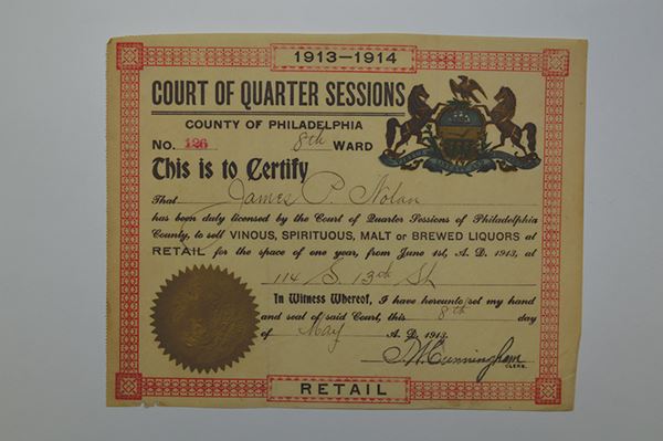 PA. Large format Philadelphia Liquor License. 1913-1914. Fragile paper, nice imprint of Pennsylvania State seal. Fine.