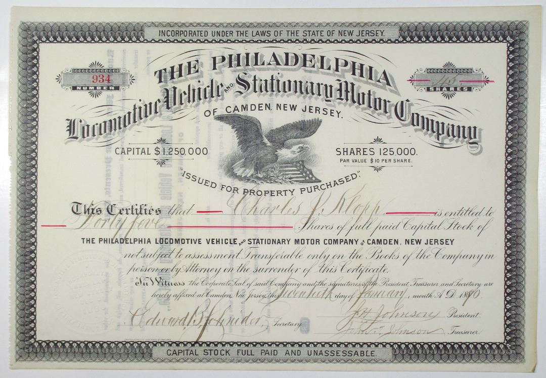 New Jersey, 1890. 45 Shares I/U Capital Stock Certificate, Black text with black border, Eagle and shield at center. Fine condition.