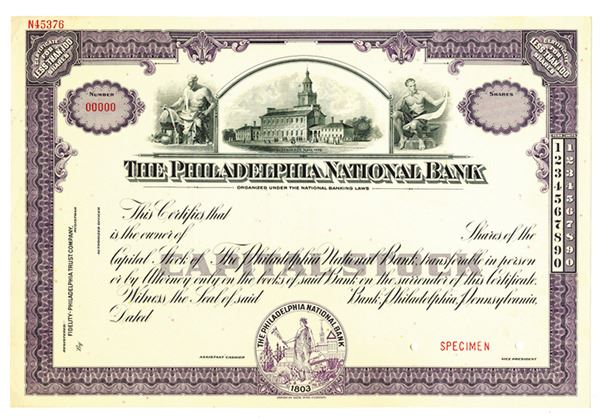Pennsylvania. <100 Shares Capital Stock Specimen Certificate, Black print on purple border and under tint, Allegorical figures flank Independence Hall at top, Specimen overprints and POC's, VF-XF condition, ABNC.