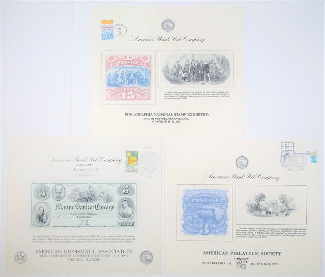 Pennsylvania & Illinois......, 1991. Collection of Souvenir Cards from conventions and shows, Includes: US Postage 15 Cent stamp featuring the Landing of Columbus, issued in 1869 (5); US Postage 3 Cents stamp featuring locomotive from "The Crossing" engraving, issued in 1869 (5); Marine Bank of Chicago $3 Note, Issued in 1864 (5). All certificates have stamp at top corners, XF-AU condition. (15 pieces total). Sold "AS IS" no returns accepted.